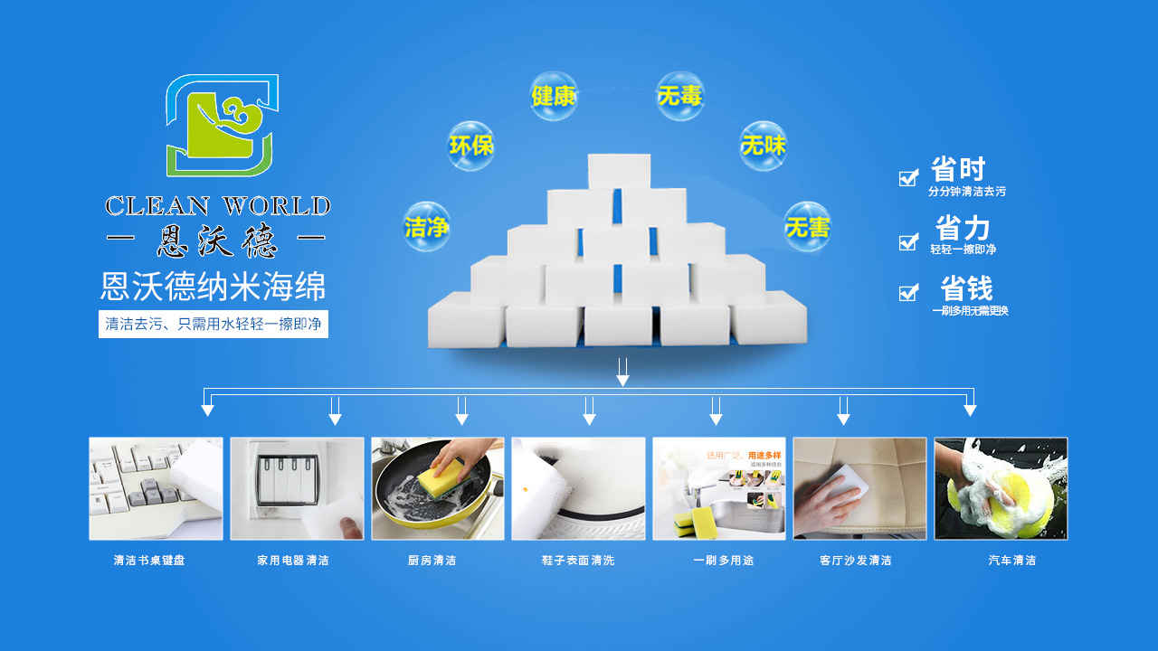 納米海綿是一種有高開孔率的三維網(wǎng)格結(jié)構(gòu)的新型泡沫塑料,采用物理去污的機理,依靠納米海綿特殊三維網(wǎng)狀結(jié)構(gòu)(每個小顆粒比頭發(fā)絲的萬分之一還?。⑵浣窈?,其內(nèi)部就會形成無數(shù)個納米級毛細管開孔結(jié)構(gòu),在抹拭過程自動吸附物體表面的污漬。所以這些海綿塊只需要加一點水,就變成清潔力強的產(chǎn)品,可以擦拭頑固的污漬,也不用擔(dān)心會有刺激性化學(xué)物質(zhì)。納米海綿可以用于家中的大多數(shù)物品的表面,從油煙機到灶臺、墻壁上的畫畫印記、浴室里的水漬水垢、浴缸污垢、茶杯里的茶漬、墻壁劃痕等通常難以擦洗的表面。